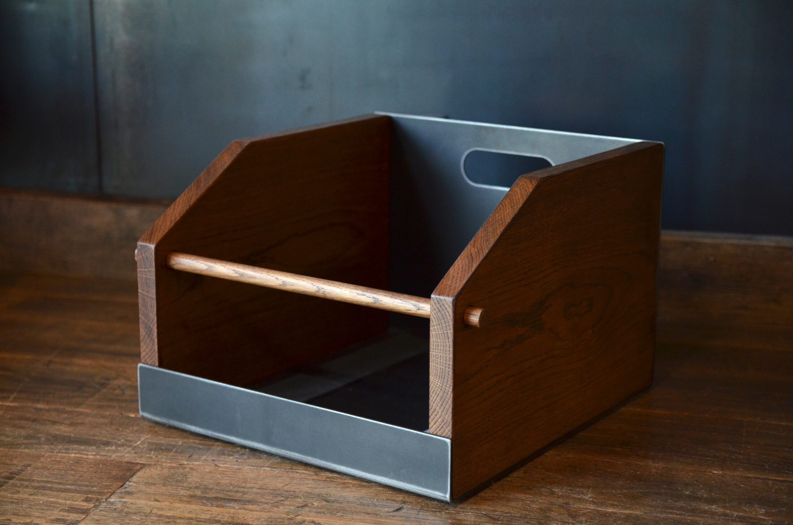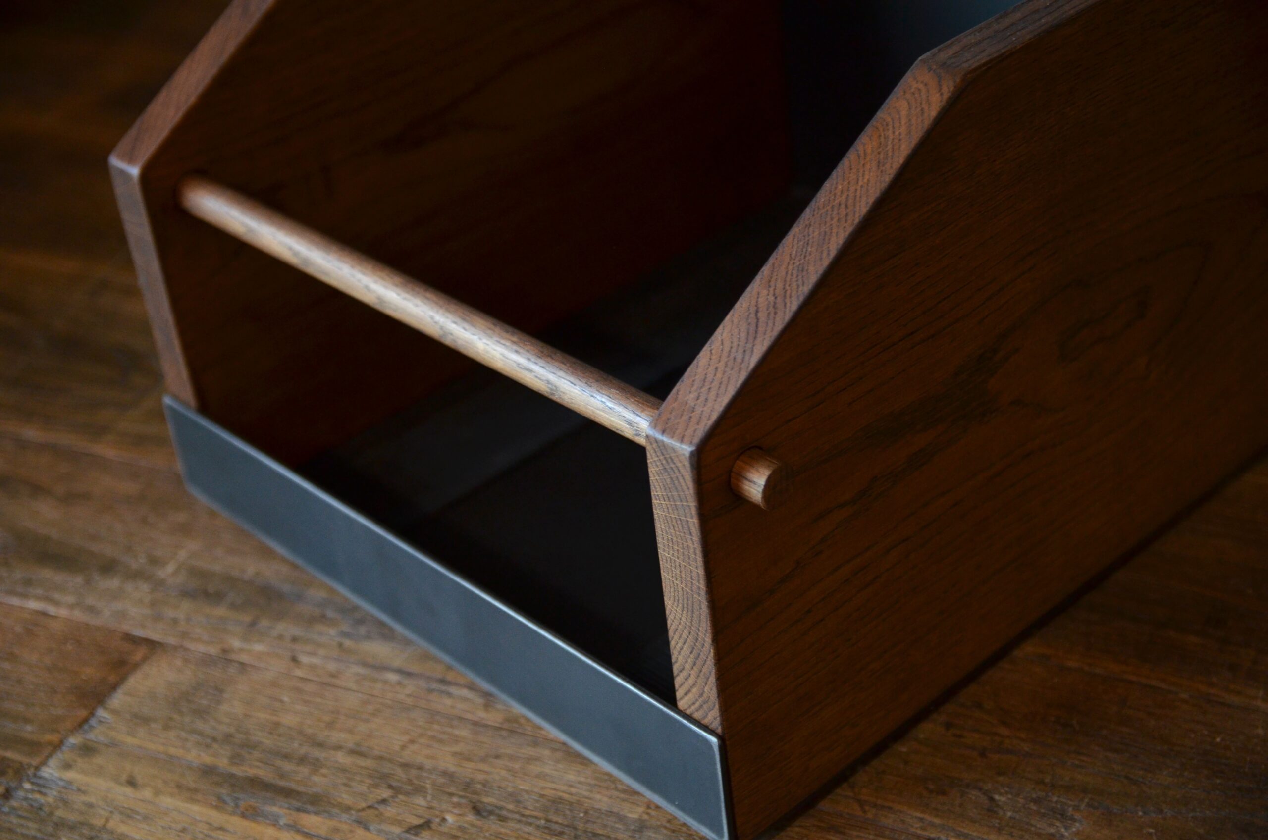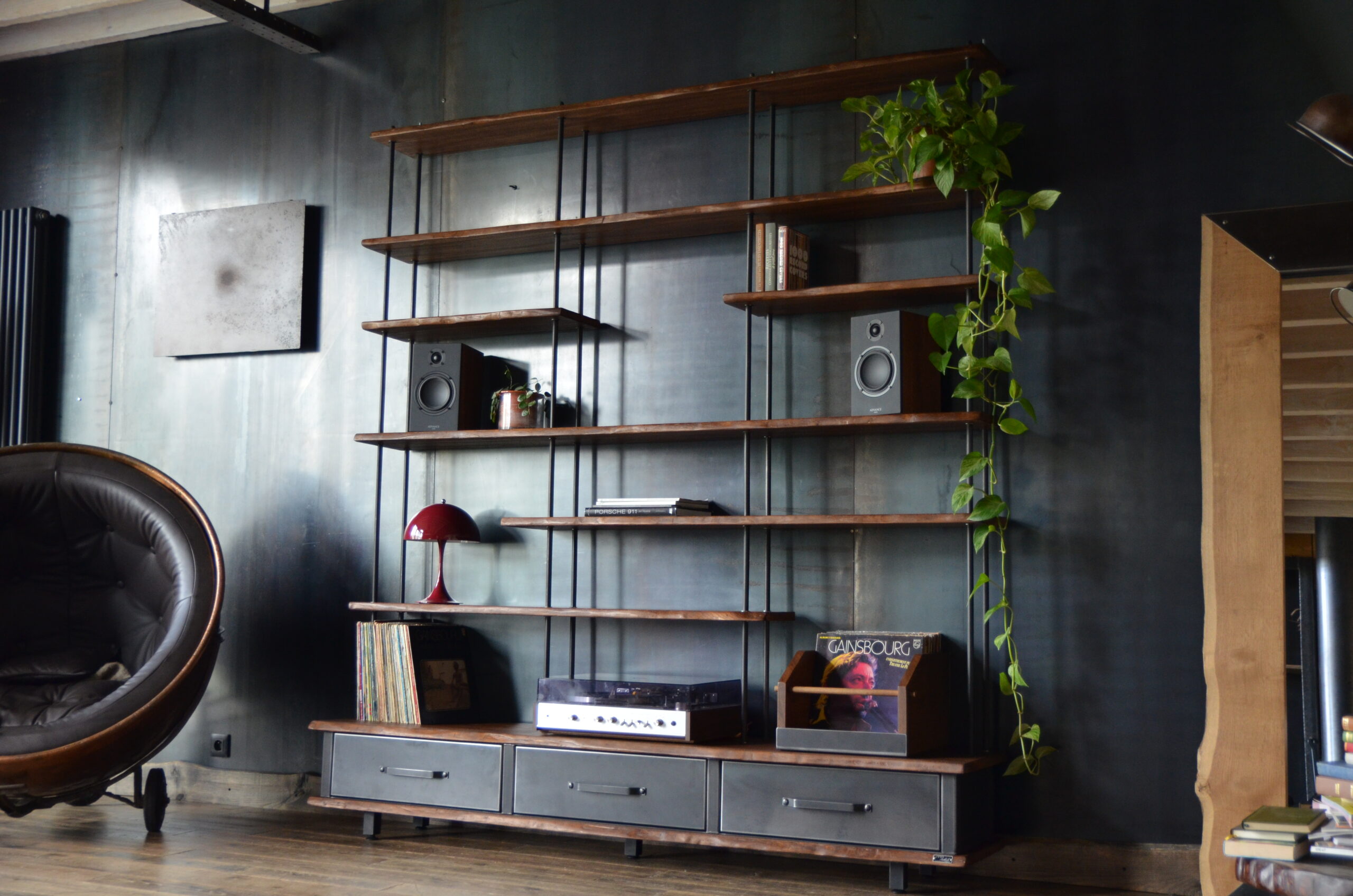 Bac rangement vinyle ÉRATO chêne massif teinté, barreau bois, plaques acier patiné — Micheli Design Laval