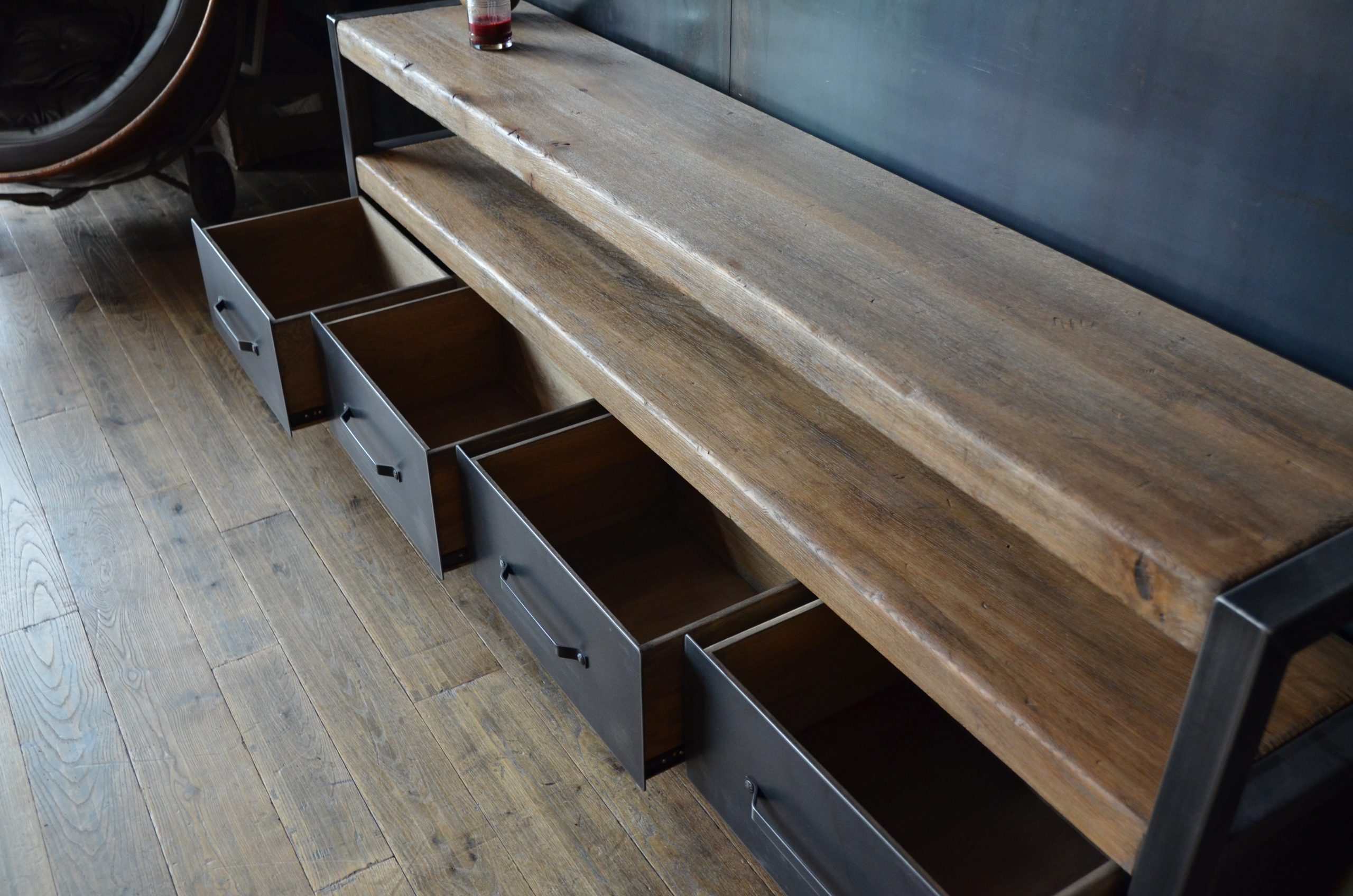 JUVENTAS reprend les codes du mobilier d’atelier : bois massif épais, acier patiné, tiroirs fonctionnels et ligne compacte adaptée au salon.
